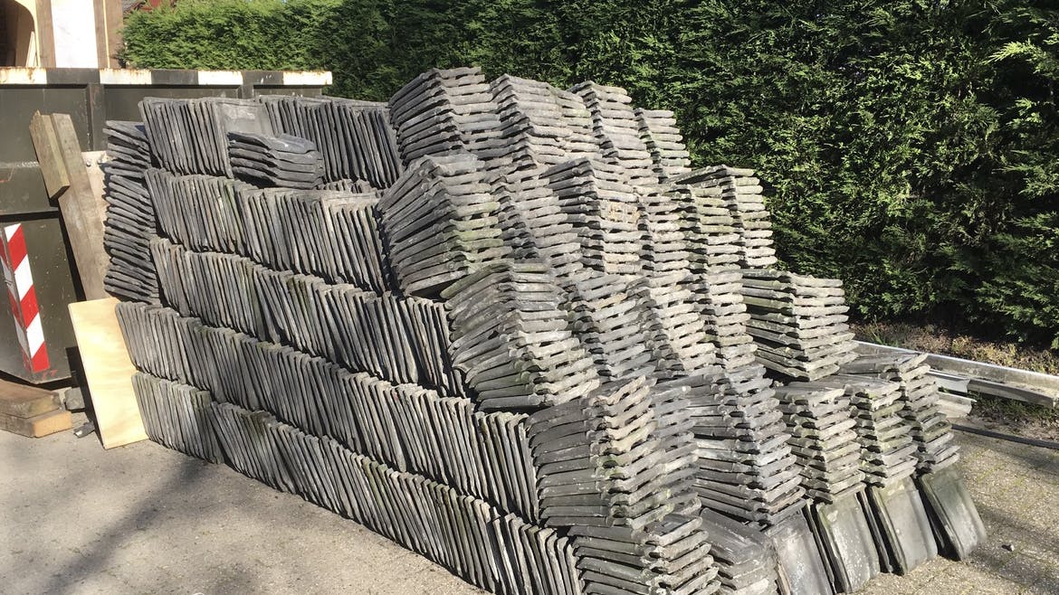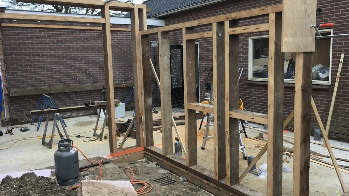 Ruim 100 oude balken uit een varkensschuur gebruikten we om skeletwanden te bouwen. De schuur werd gesloopt. En de houten balken mochten we gratis meenemen.