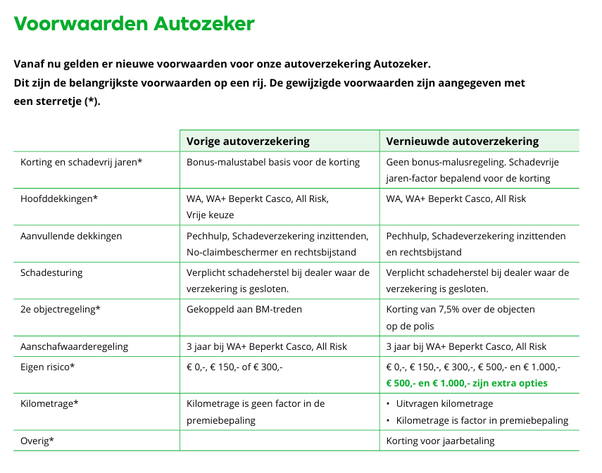 Voortaan vragen we een inschatting van het aantal te rijden kilometers per jaar op. Hiermee sluit het aanbod beter aan op het daadwerkelijke gebruik van de auto. En klanten kunnen kiezen uit meer eigen risico categorieën: €0, €150, €300, €500, en €1.000. Die laatste twee zijn nieuw. Bovendien wordt de acceptatie strakker en flexibeler, wat helpt om scherpe tarieven te bieden.