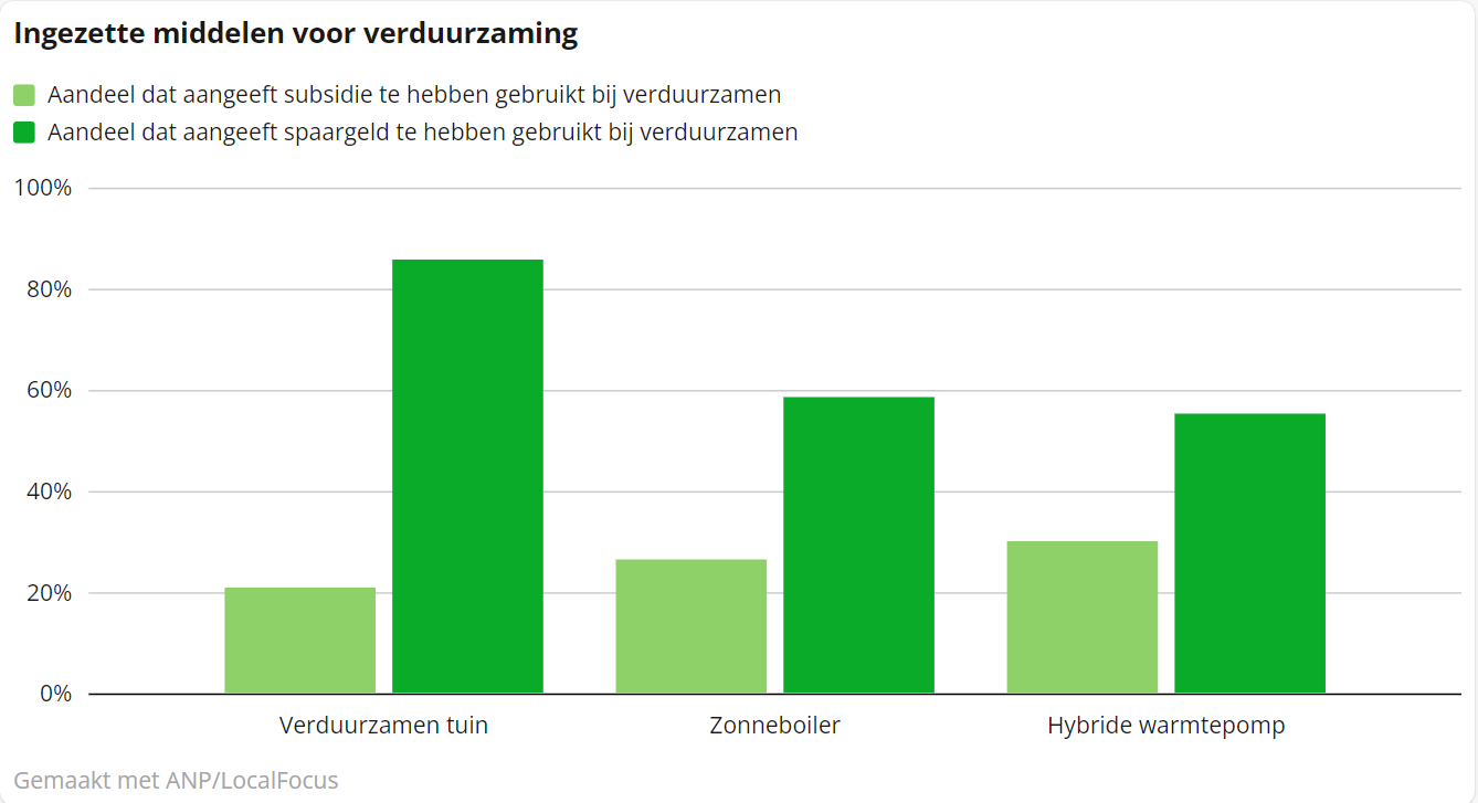 Om inwoners te stimuleren hun tuin groener te maken, bieden veel gemeenten subsidies aan. Toch maakt lang niet iedereen hier gebruik van: slechts 21% van de mensen die hun tuin verduurzaamt, maakt gebruik van subsidie. Het overgrote deel gebruikt spaargeld om dit te betalen. Mogelijk omdat zij niet op de hoogte zijn van deze subsidies.